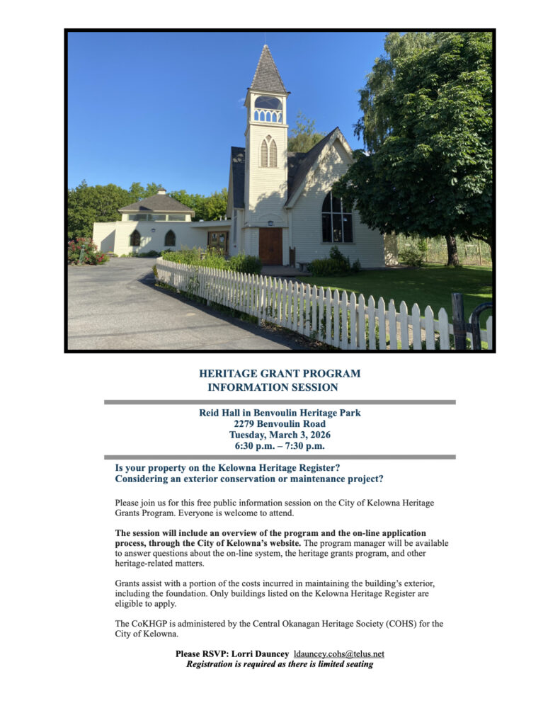 In 1991 the City of Kelowna created a program whereby grants, using City of Kelowna tax dollars, could be given to those who own buildings on the Kelowna Heritage Register in an effort to help them maintain and conserve their heritage properties.